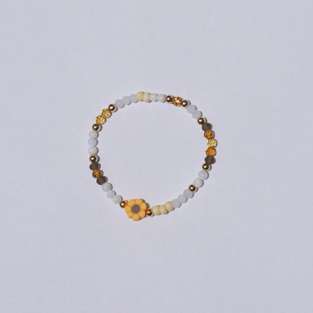 Hailey Bracelet features an earthy mix of beads including natural trochus shell beads, 18k gold plated beads, glass crystals, and a clay sunflower. This bracelet is the standard size, measuring 6.5 inches.