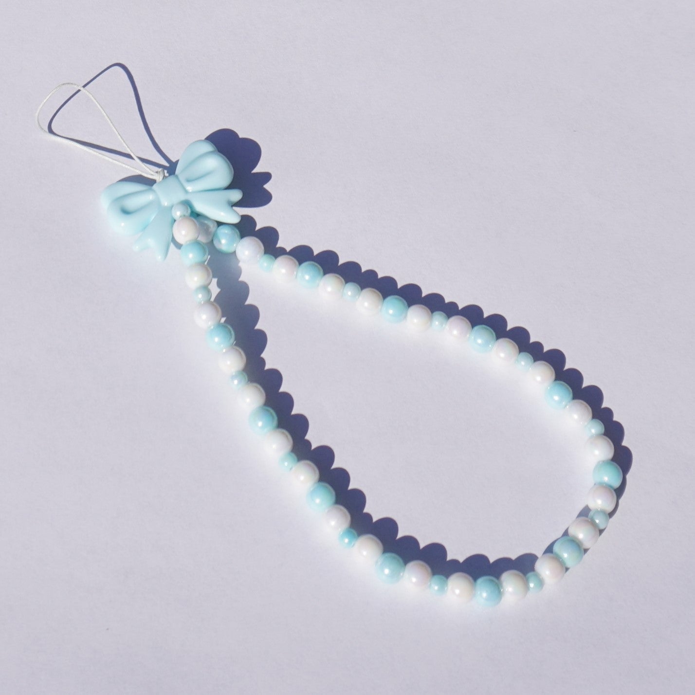 Cute blend of pearly and light blue acrylic beads with a bow. Made to loop through side hole on phone case. Measures about 6 inches when attached to phone.