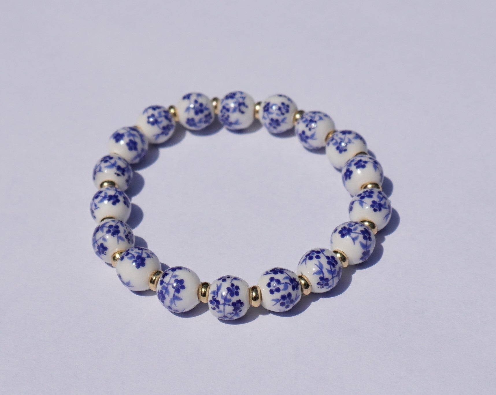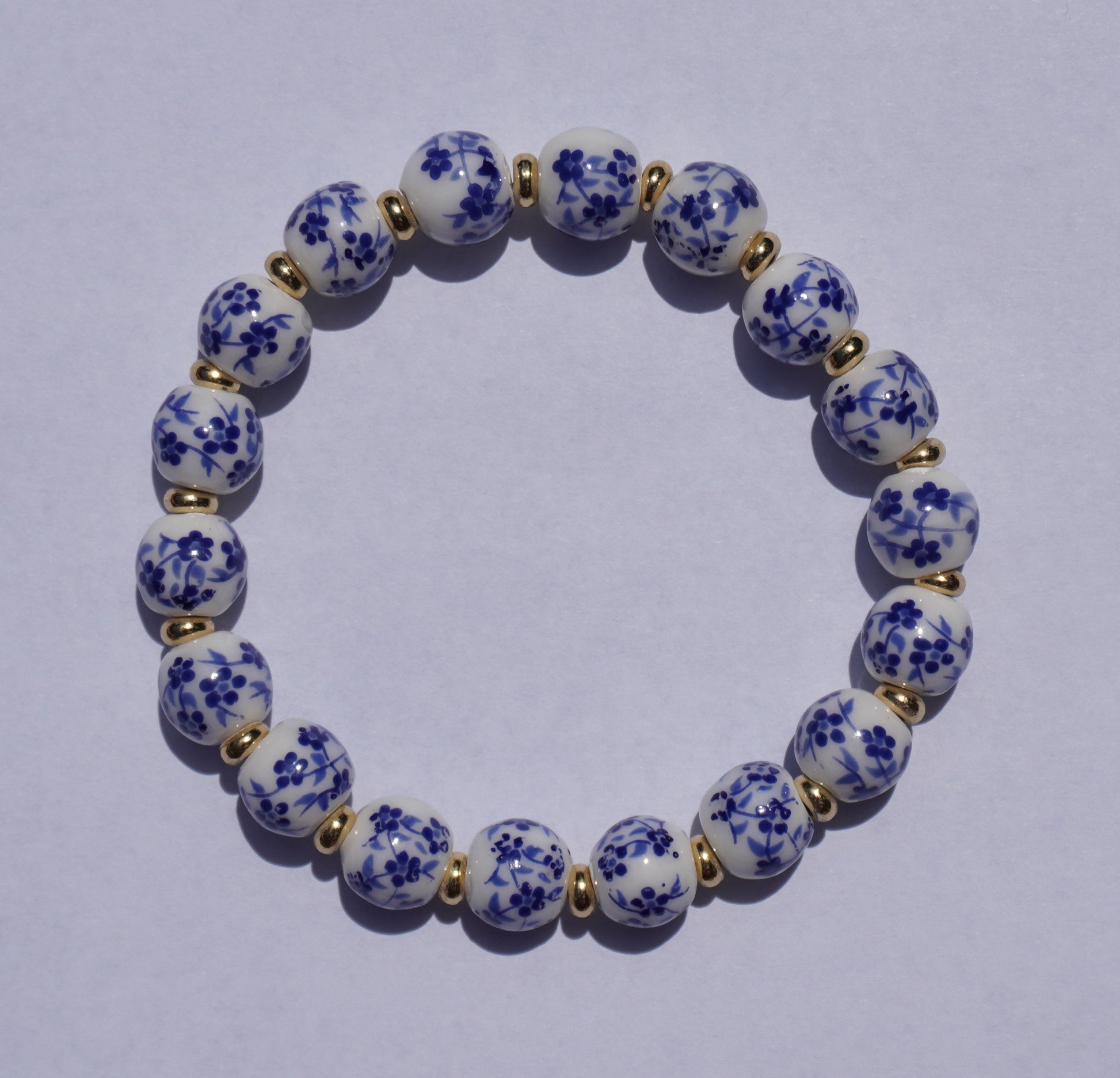 This bracelet features blue and white porcelain beads mixed with 18k gold plated spacers.