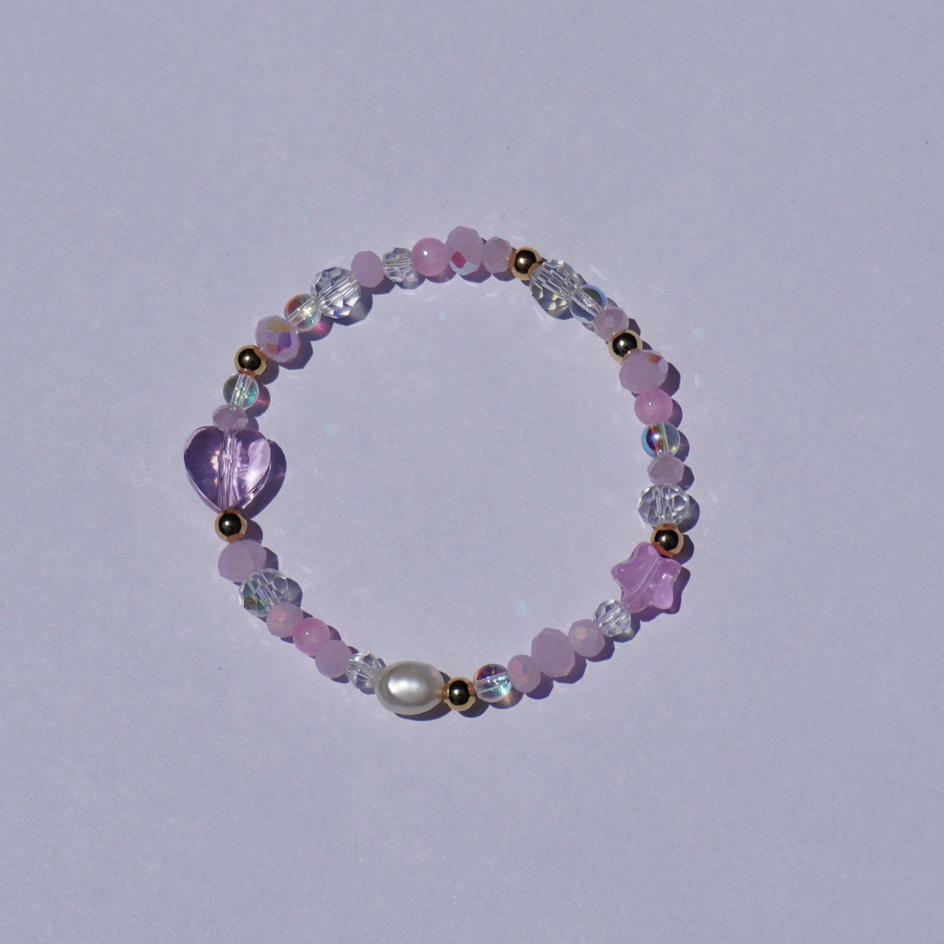 This girly bracelet features pastel pink and clear glass crystal beads, accented with a heart, star, natural freshwater pearl, and touches of gold. A sweet, sparkling piece full of charm and softness. Measures standard 6.5 inches