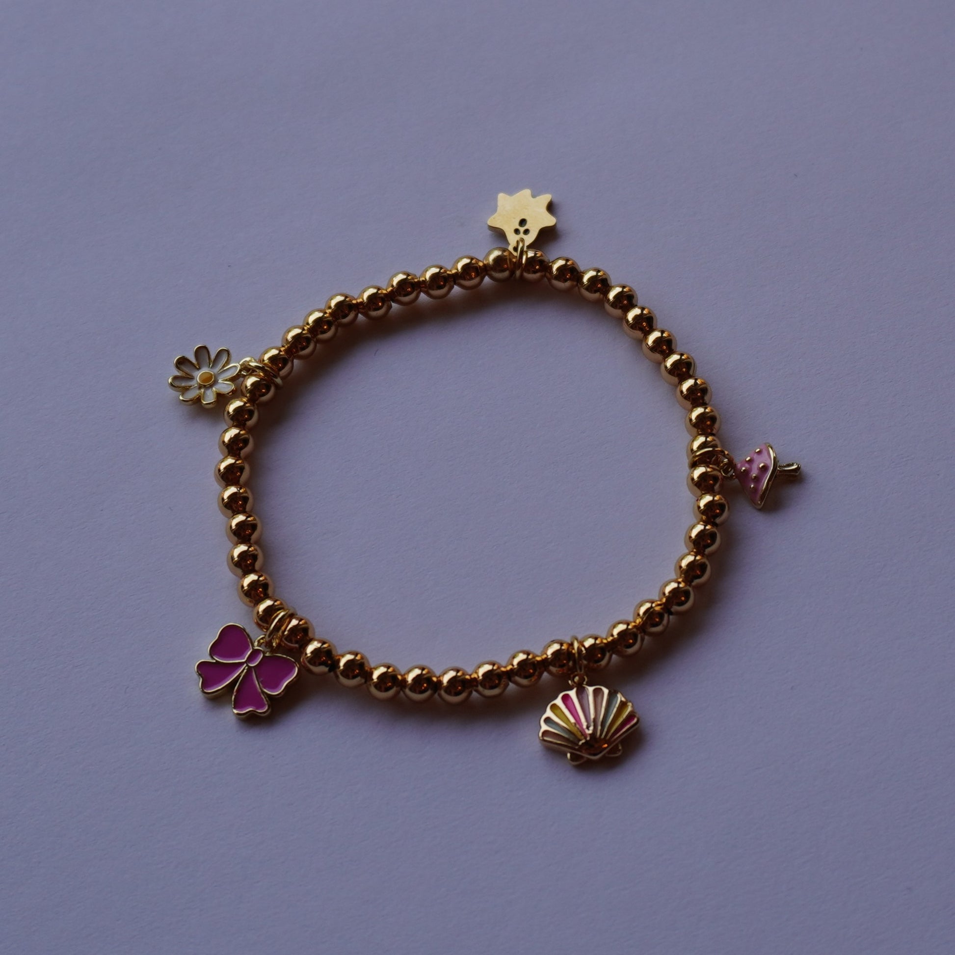 The signature Classic Gold Bracelet, adorned with five of our favorite whimsical charms—a pink bow, mini mushroom, little ghostie, a daisy, and enameled seashell—all 18k gold plated. It’s playful, magical, and made to bring a little charm to your everyday.