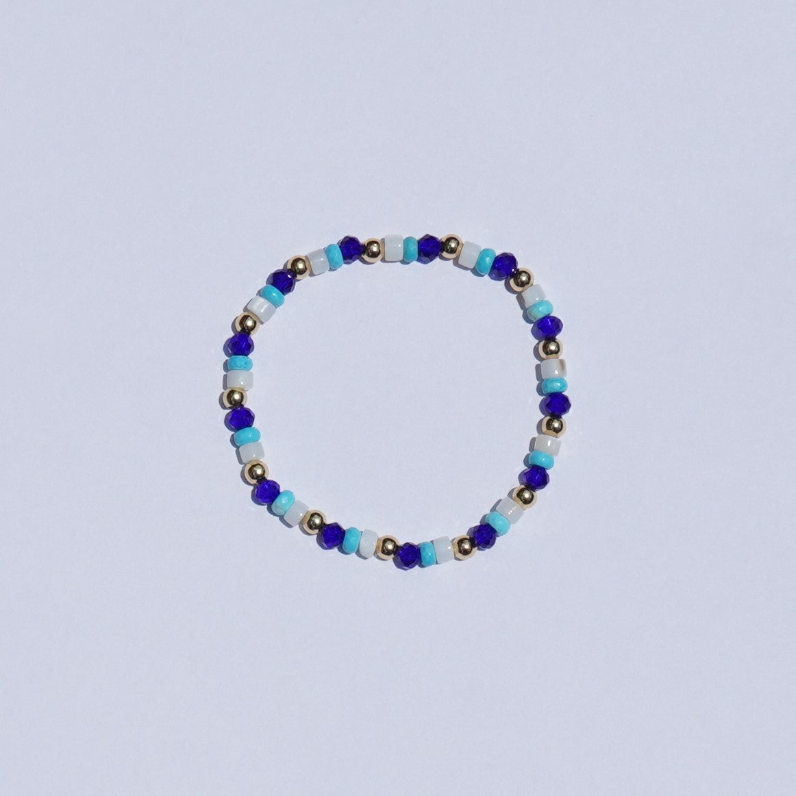 A bold, beachy beauty. The Marina Bracelet features vibrant blue glass beads, white natural shell, dyed natural Howlite, and 18k gold-plated accents—bringing coastal energy and golden glow to your stack.