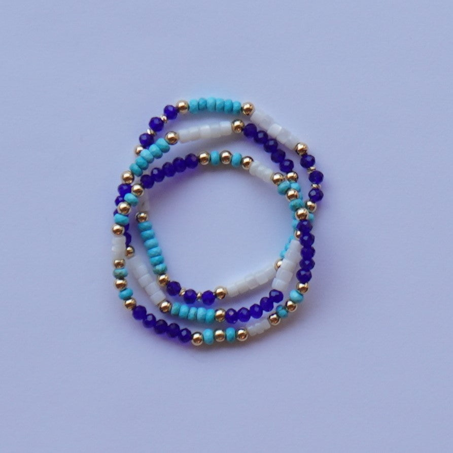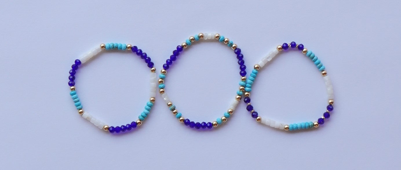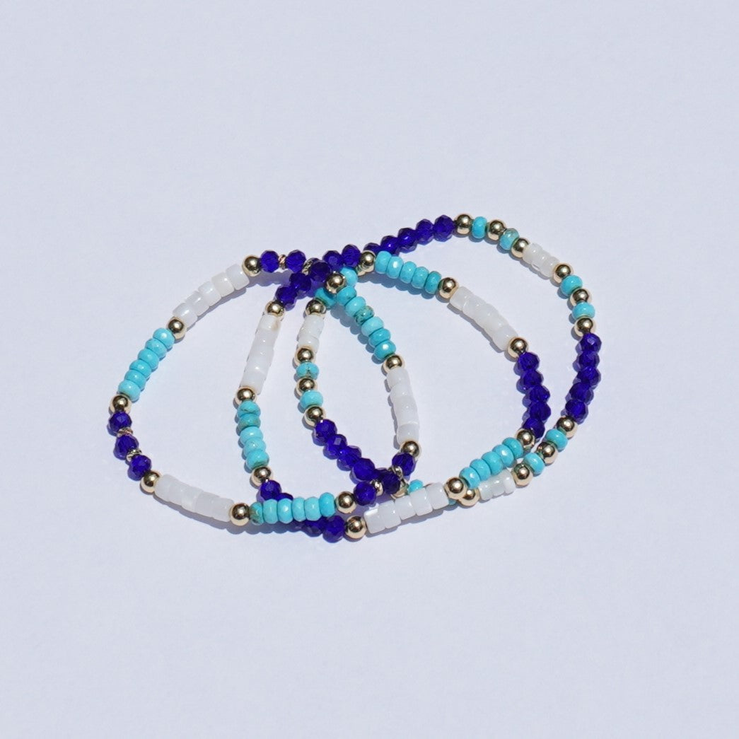 Inspired by the sea, this set features three unique bracelets made with bold blue glass, white natural shell beads, dyed natural howlite, and 18k gold-plated accents. Each bracelet is different, but designed to stack perfectly for a bright, beachy look.