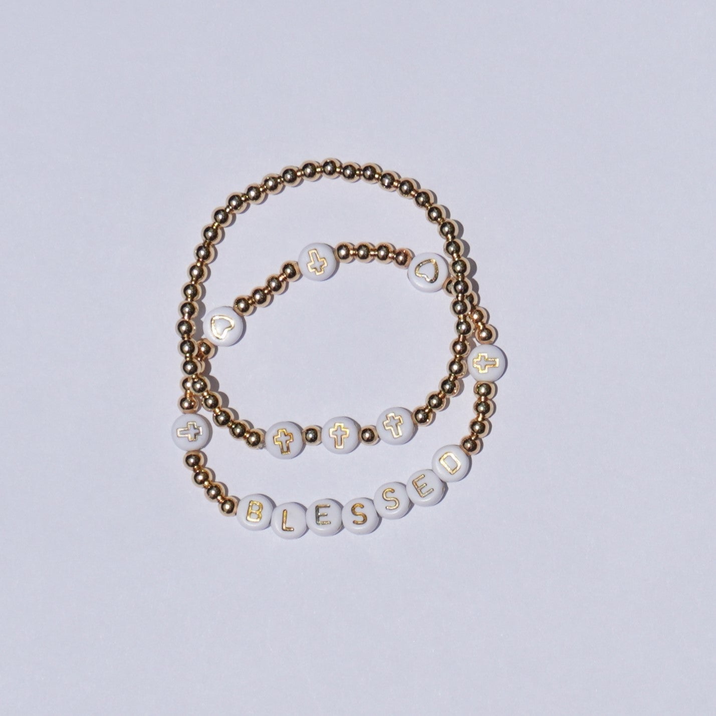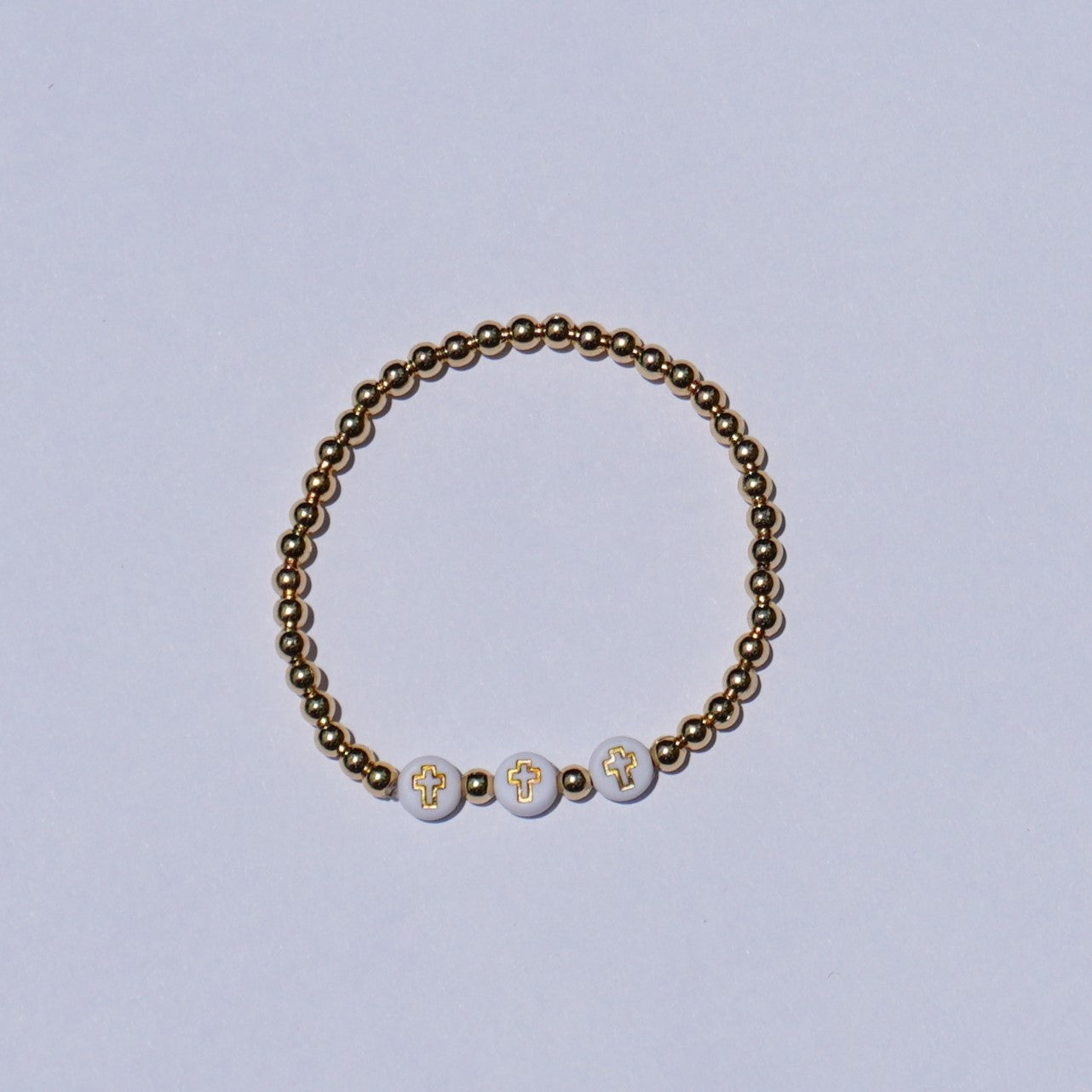 This beautiful 18k gold plated beaded bracelet features three letter bead crosses.